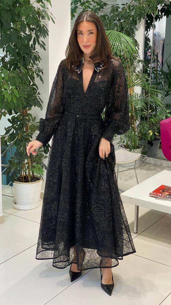 الأسلوب: تصميم أسود راقٍ بأكمام شفافة تضيف فخامة أنثوية.