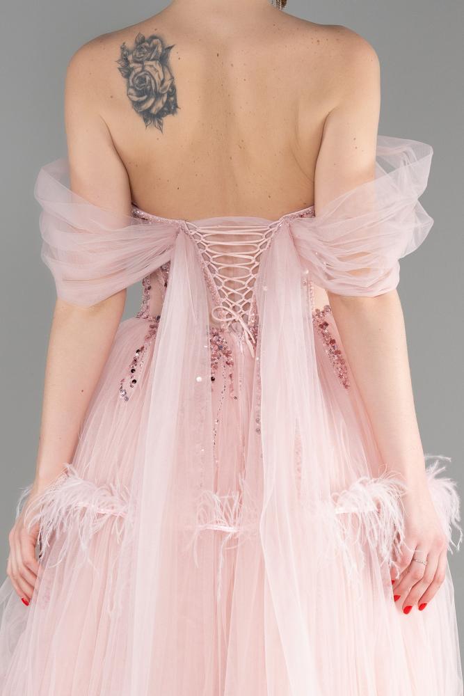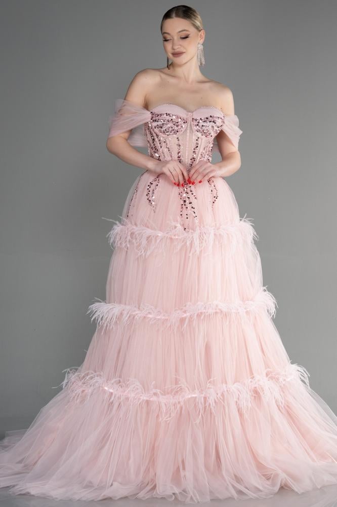 - الأسلوب: تصميم فاخر مزين بالريش والتطريزات اللامعة لإطلالة ساحرة.