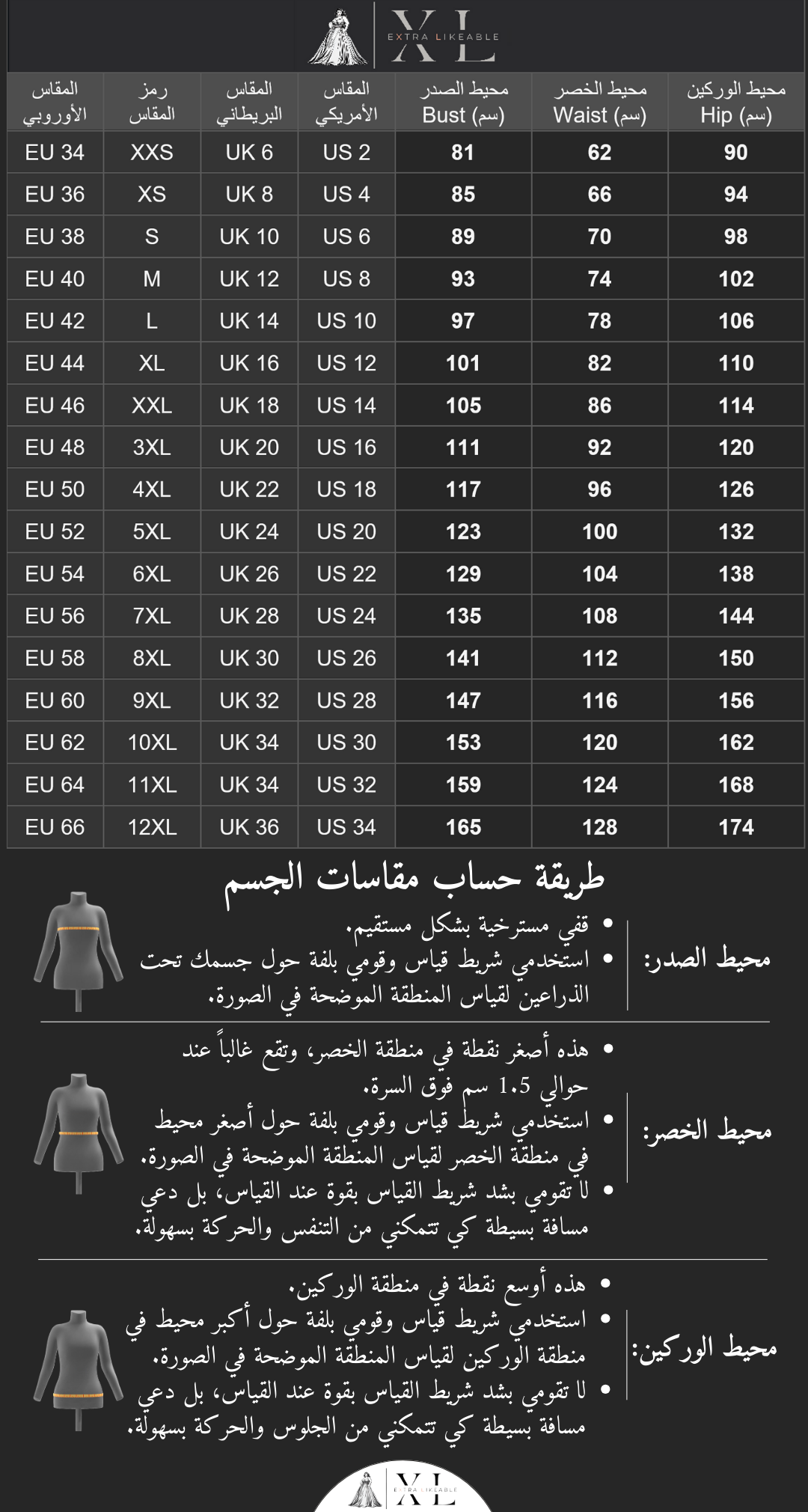 متوفر مقاس أوروبي من 46 EU إلى 66 EU ، ويعادل مقاس بريطاني من 18 UK إلى 38 UK.