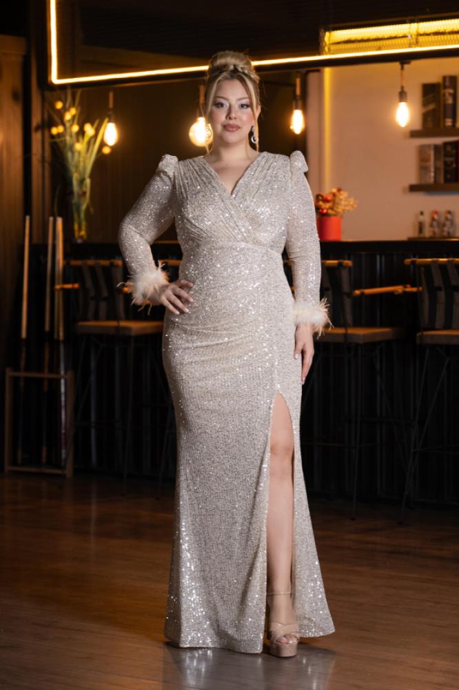 فستان سهرة ترتر بأكمام ريش – من اكسترا لايكبل