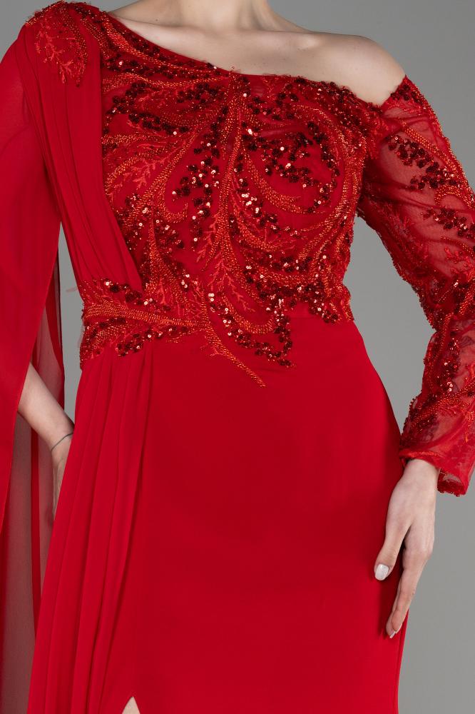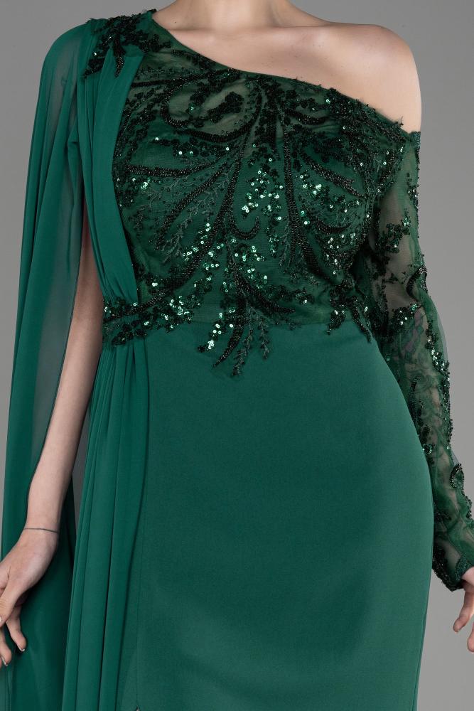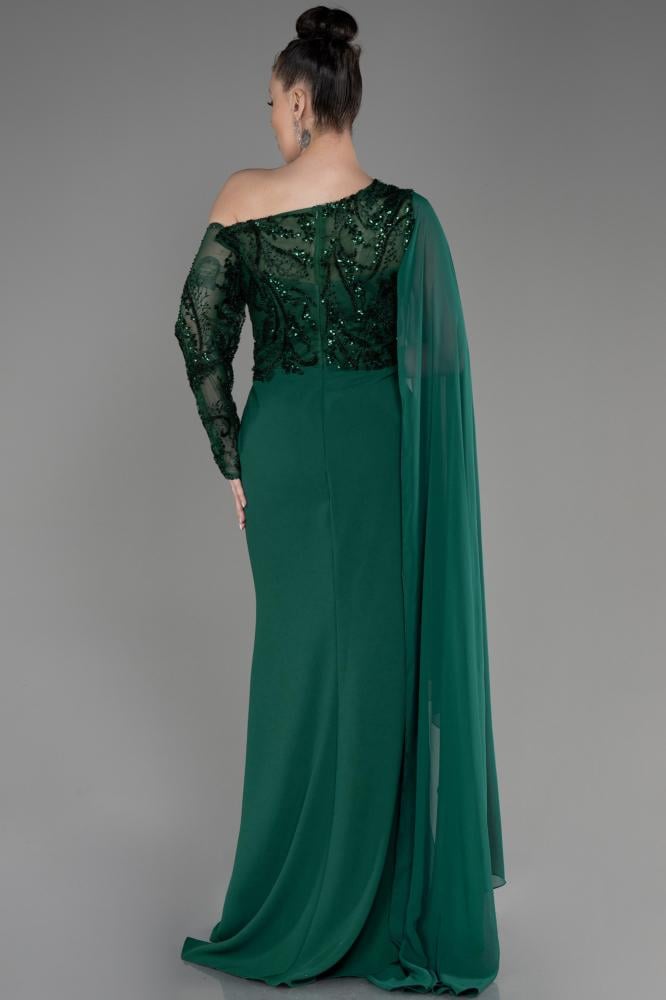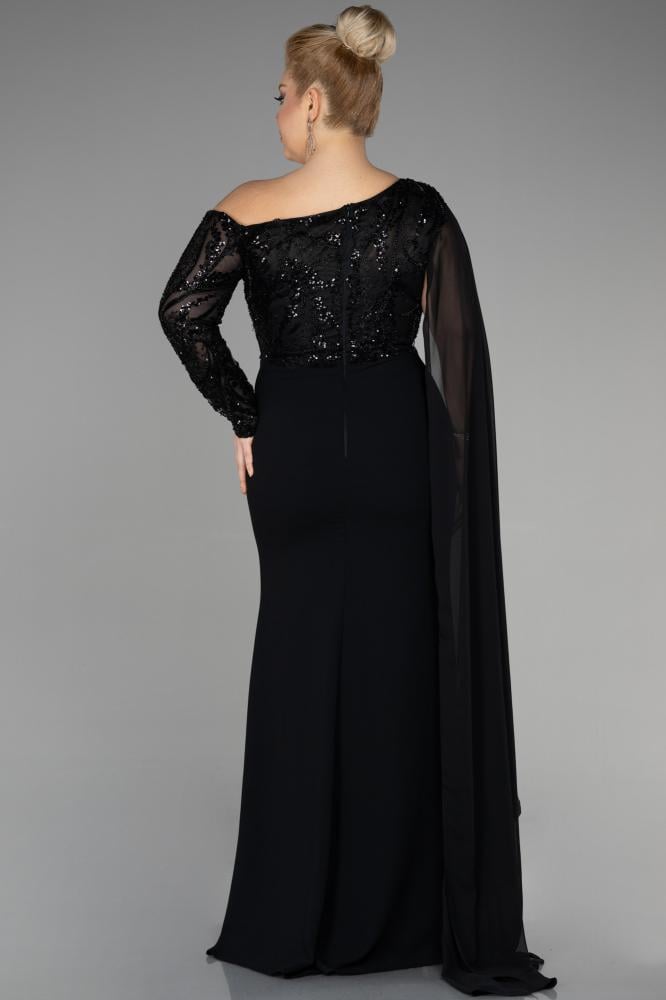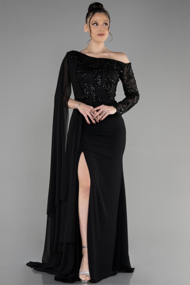 فستان السهرة المذهل هذا مصنوع من الكريب الفاخر، وهو يكسو الجسم في صورة ظلية تعانق الجسم، مما ينضح بالثقة والرقي. إحدى الذراعين محاطة بأكمام طويلة، بينما تتراقص الأخرى بحرية في كم شال انسيابي. يضيف هذا التصميم الفريد لمسة من التباين والأناقة التي لا تنسى.