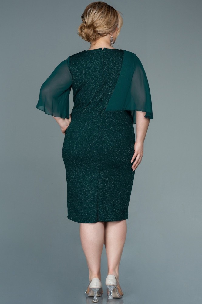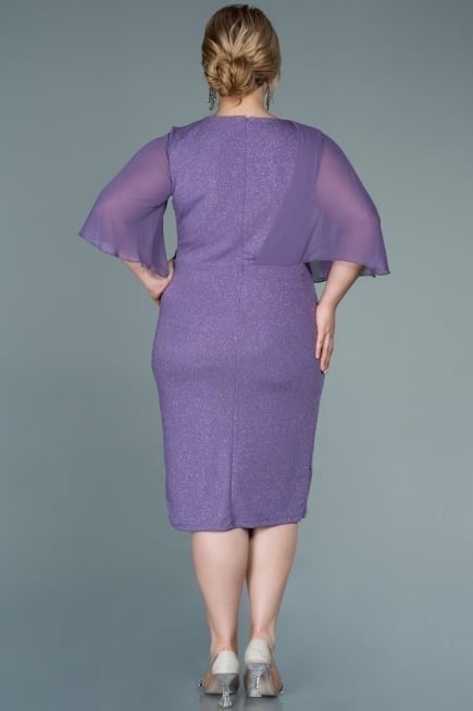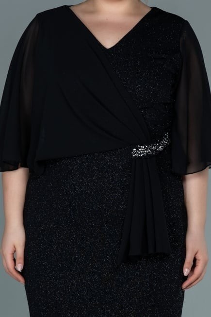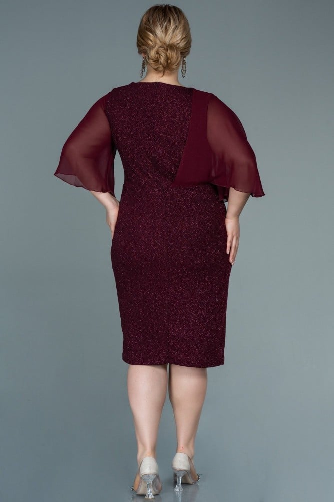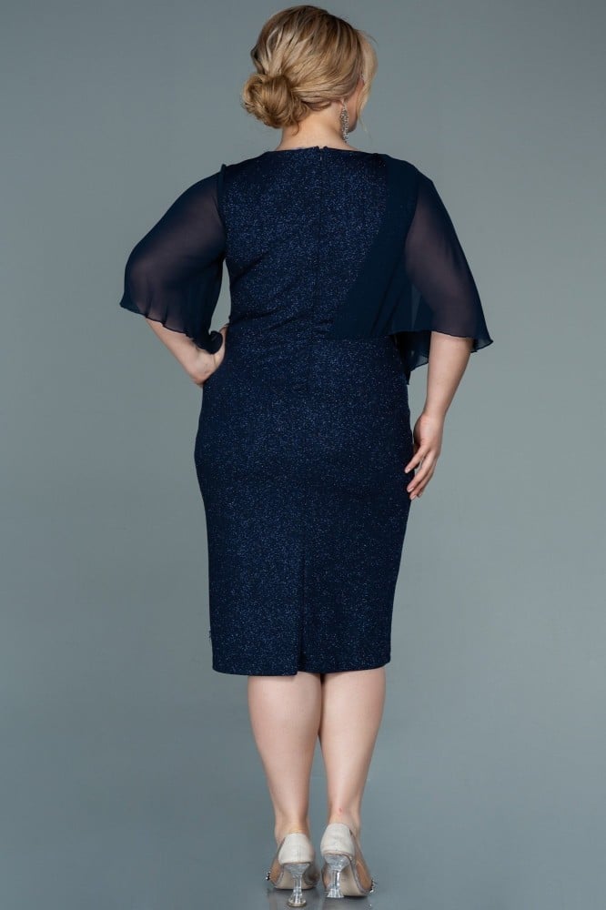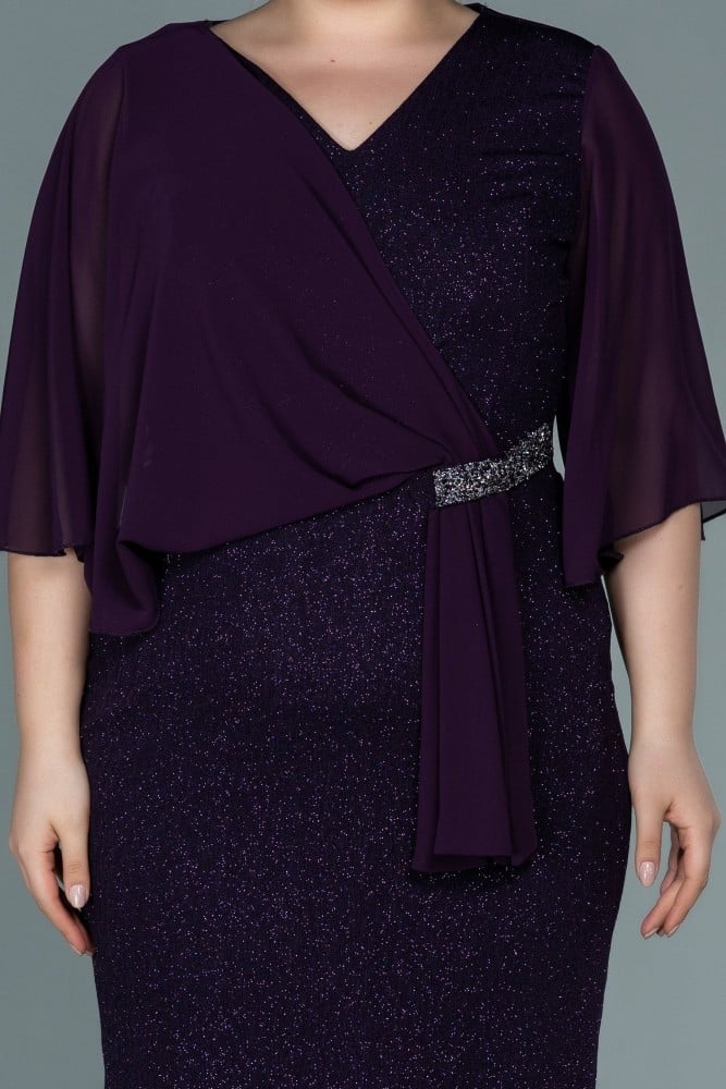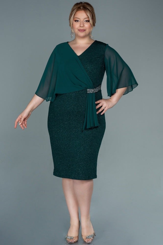 فستان سهرة أنيق ومتوسط الطول بمقاسات كبيرة. يتميز الفستان بتصميم محتشم مع ياقة على شكل حرف V وكم قصير. مصنوع من قماش الليكرا اللامع الذي يمنحك مظهرًا أنيقًا وجذابًا.
