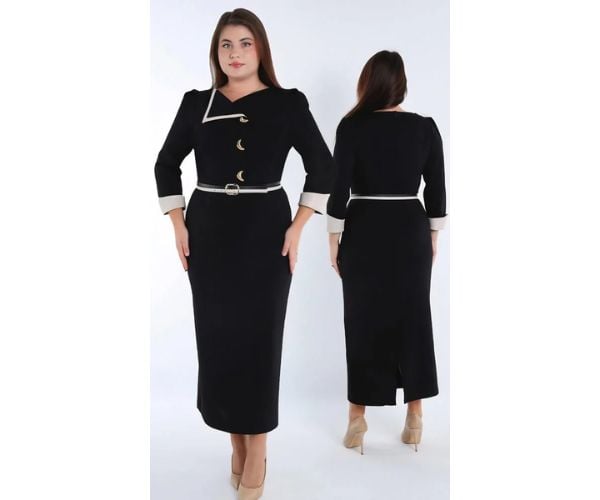 تألّقي بإطلالة تجمع بين الفخامة والرقي مع هذا فساتين سوداء تبرز جمالك بأسلوب عصري متقن. فيتميز تصميم الفستان بياقة ناعمة ذات أطراف بيضاء تمنح لمسة تباين راقية، يتكامل معها الحزام الأنيق باللونين الأبيض والأسود ليُبرز جمال الخصر بانسيابية أنثوية.