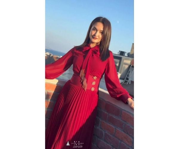 أما الأكمام المتوسطة الطول والخفيفة فتمنح شعورًا بالراحة والنعومة في آنٍ واحد مما يجعل الفستان خيارًا مثاليًا للمناسبات الرسمية أو اللقاءات العائلية الراقية، الفستان متوفر باللون الروز الباهت والأحمر والأرجواني، ليمنح كل إطلالة سحرها الخاص وإحساسها الفريد بالأنوثة.